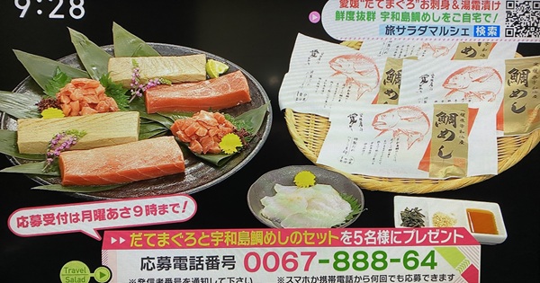 朝だ!生です旅サラダ今日の視聴者プレゼント応募電話番号を発表しました!テレビを見逃した方にご紹介します。抽選で鰹のたたき食べ比べセット・だてまぐろと宇和島鯛... -