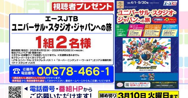 JTBとユニバーサル・スタジオ・ジャパンへの旅を視聴者に豪華プレゼント。