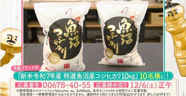 テレビ朝日DAIGOも台所 視聴者プレゼント! 新米令和7年産特選魚沼産コシヒカリ10kgが抽選で10名様に当たる。DAIGOさんMCの料理番組です。毎週月~金 ひる1時30分放送。... -